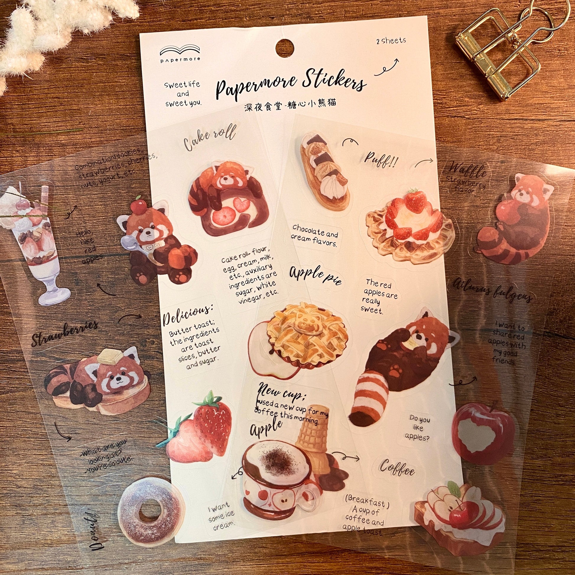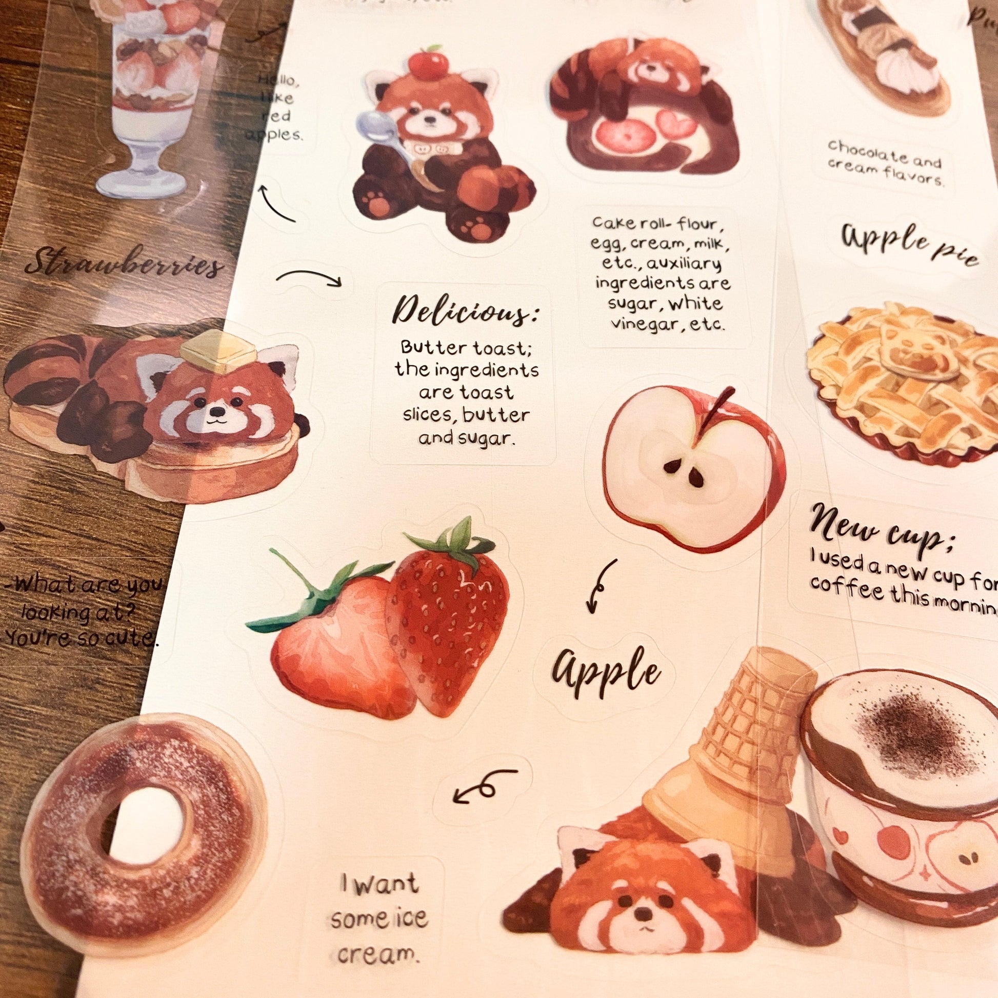 Set de Stickers PET – Sweet Raccoon (2 planchas) 🍎🍩✨