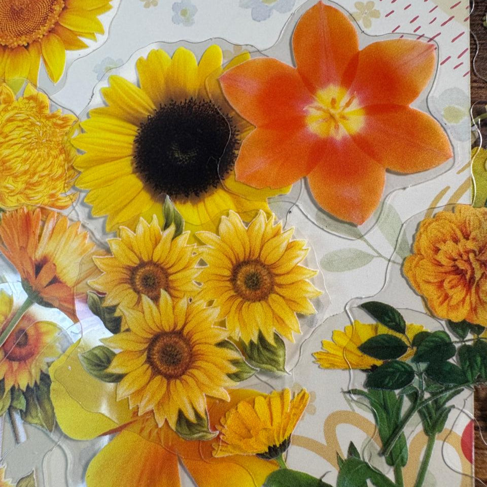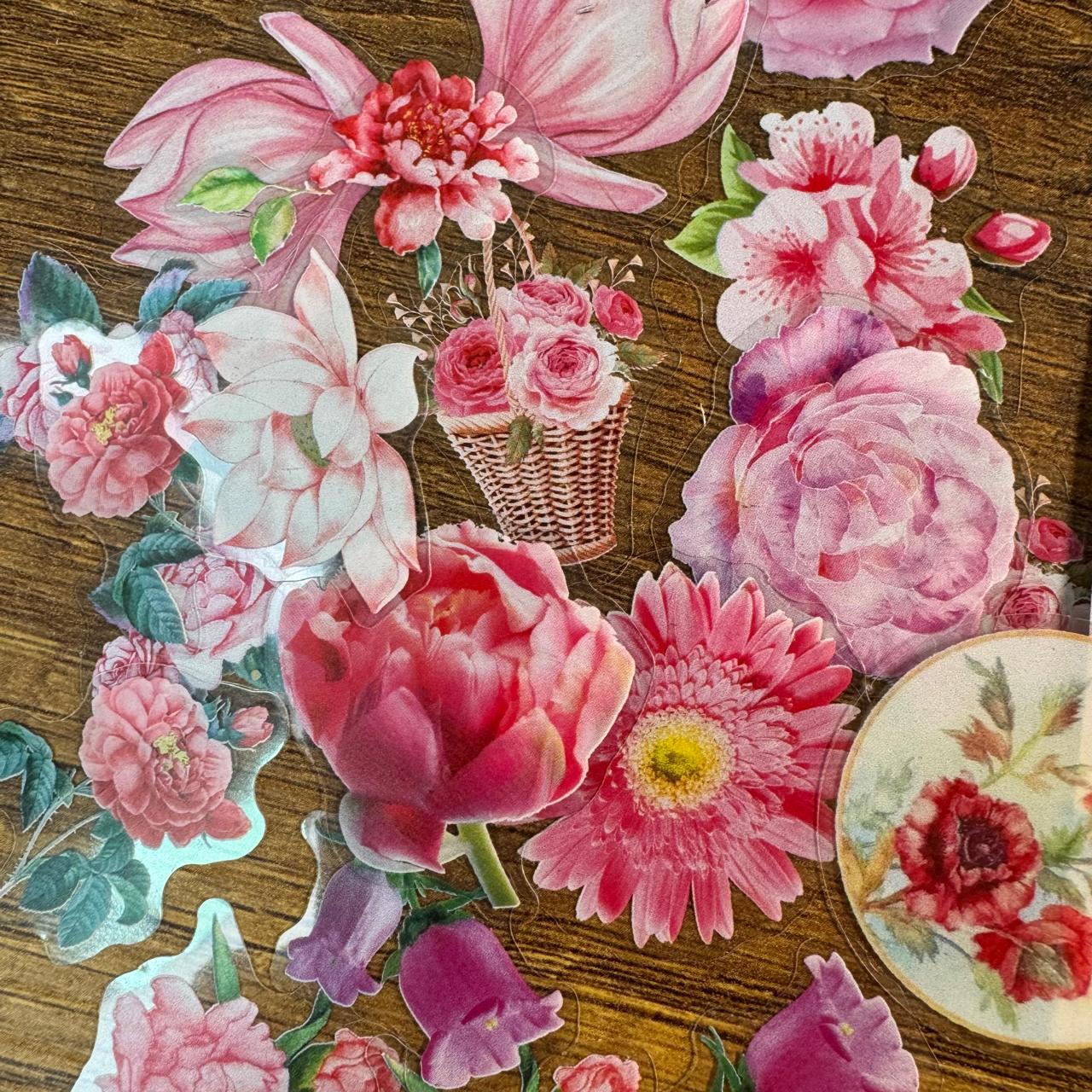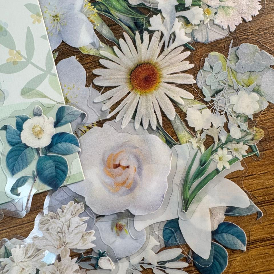 Un jardín en tus manos. Este set incluye 60 stickers en PET distribuidos en 30 modelos distintos, con 2 stickers por cada diseño. Encontrarás flores en tonos rosado, amarillo, azul, violeta, blanco y una encantadora variante de hojas verdes. Perfectos para dar frescura y color a tus journals, collages y proyectos creativos. 🌼🌿✨