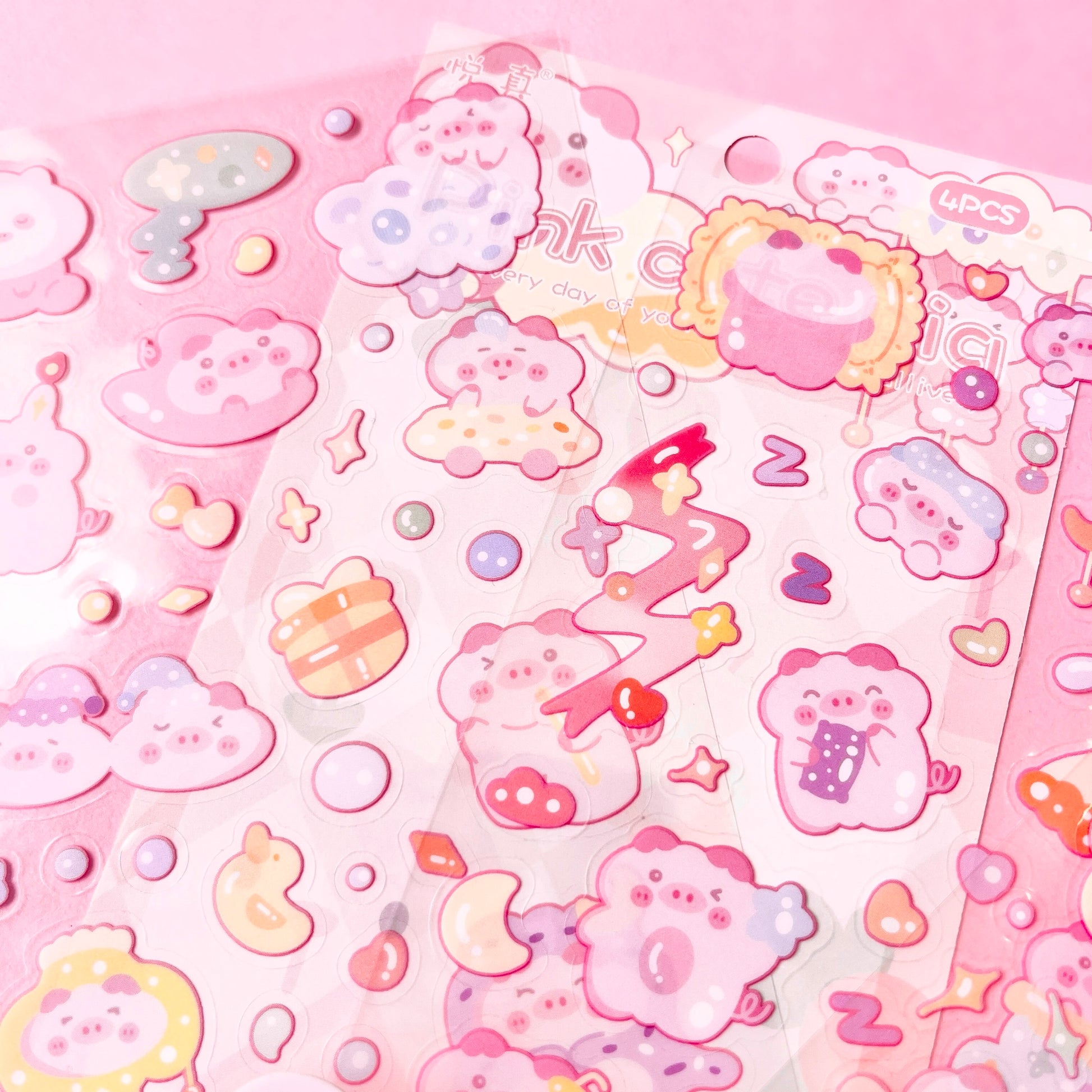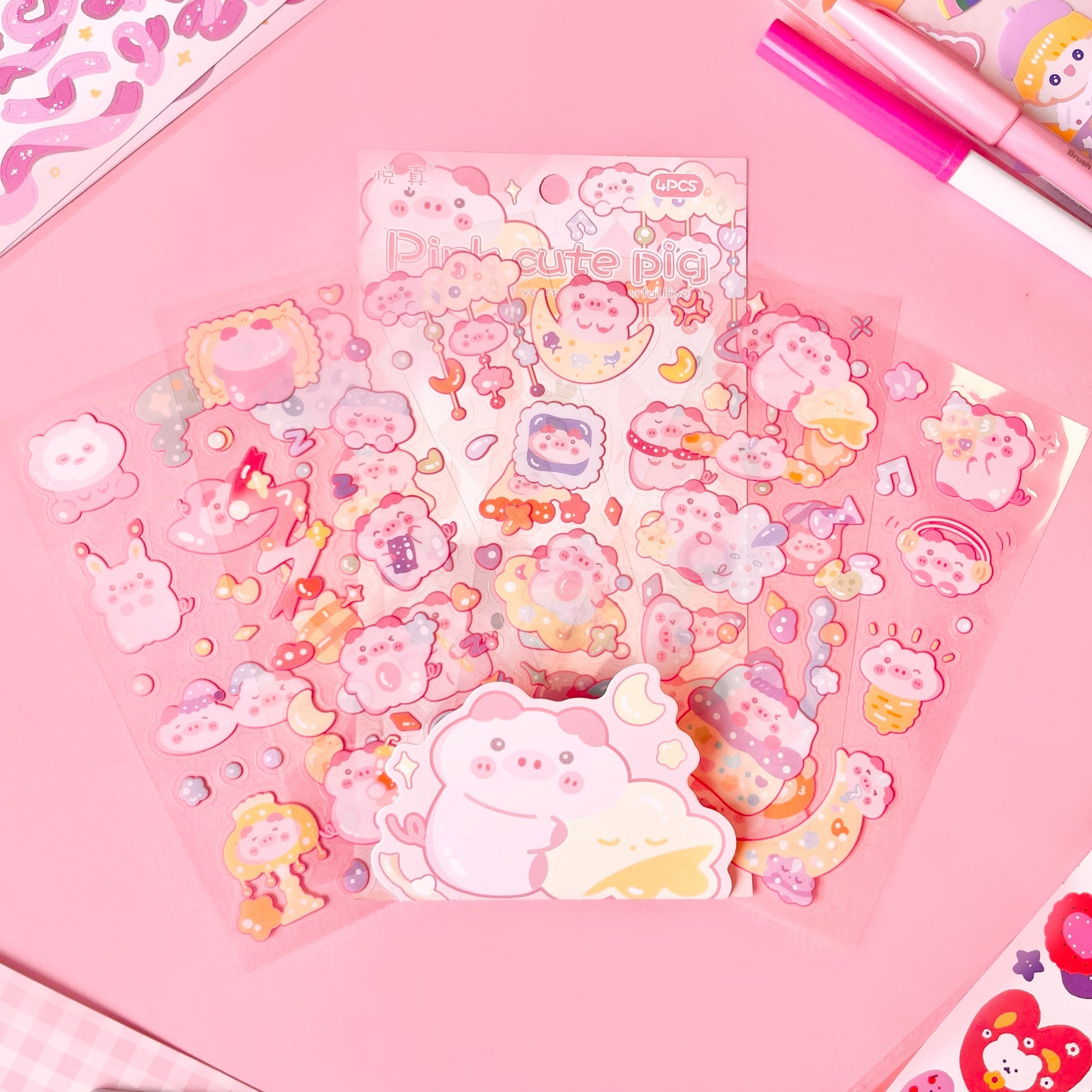 Set de Stickers Troquelados en PET – Cerdito Kawaii (4 planchitas) 🐷🎀✨