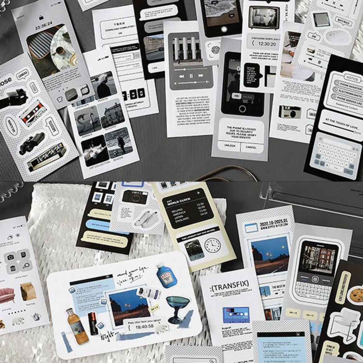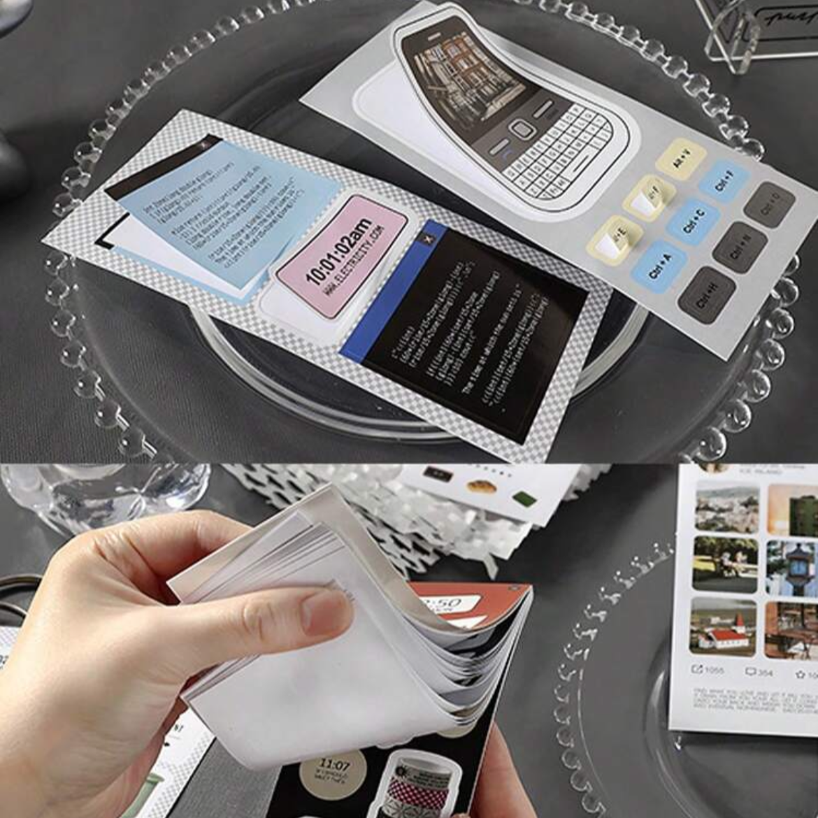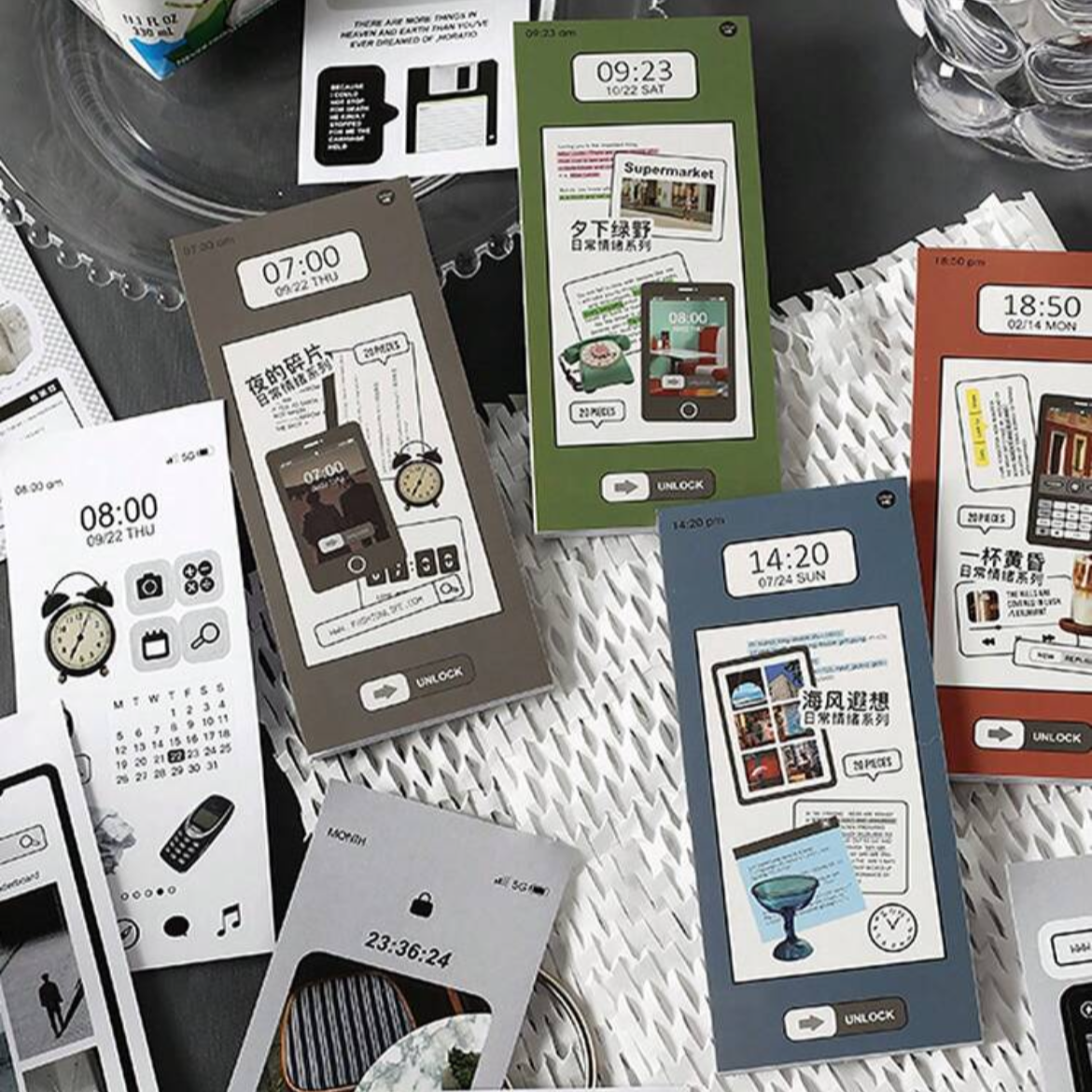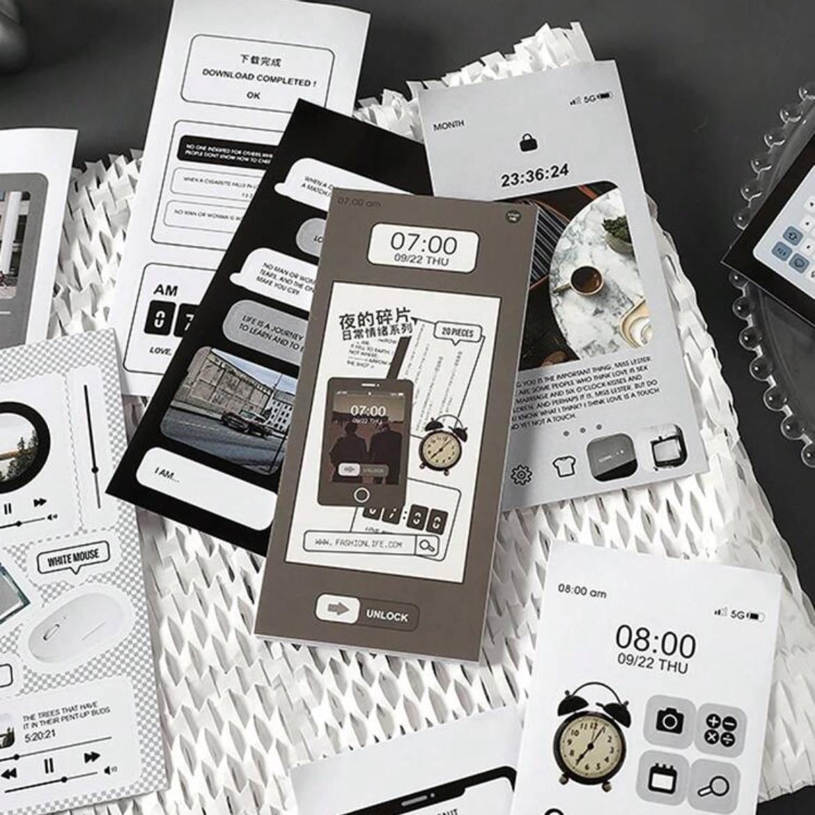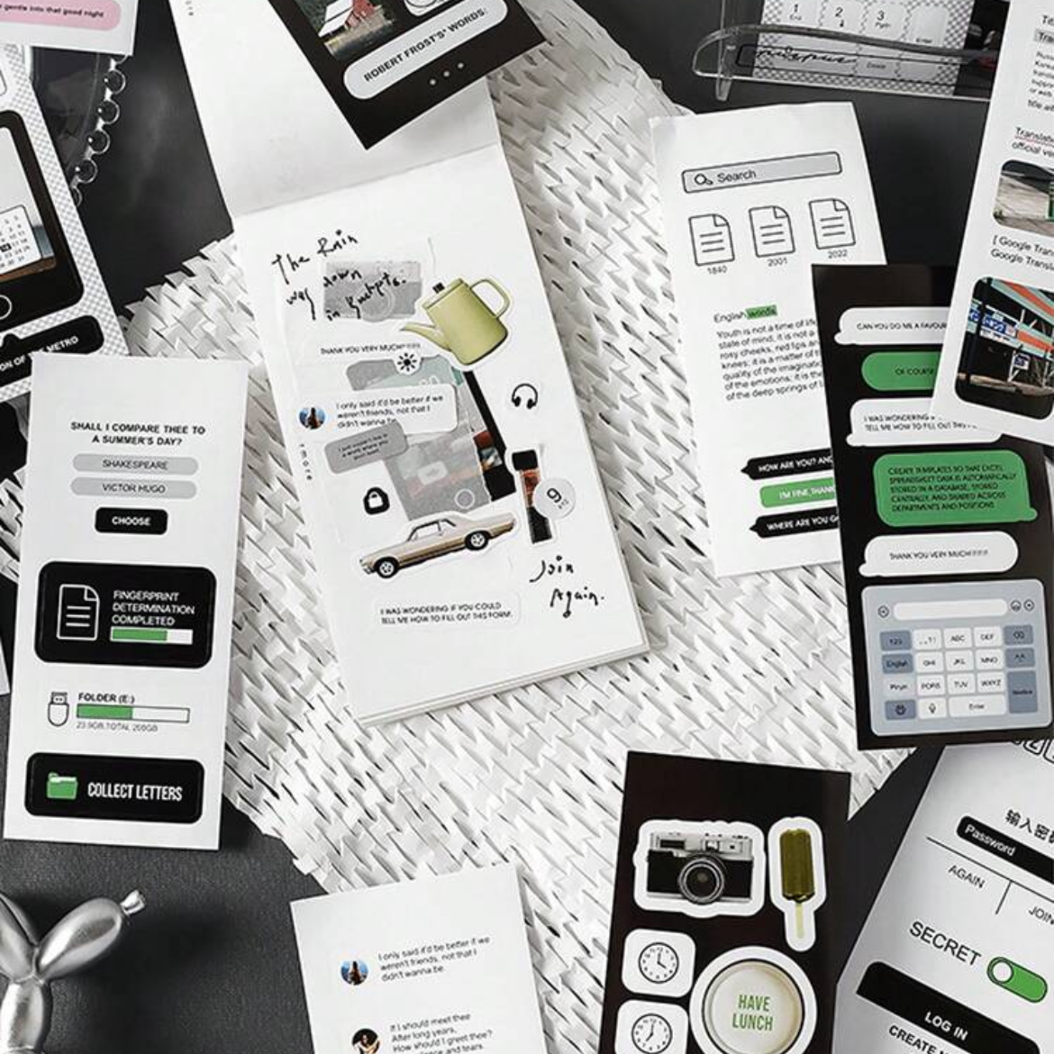 Convierte tu journal en una pantalla llena de estilo con este Sticker Book de 20 páginas troqueladas, inspirado en el mundo digital y los chats de celular. 💬✨ Con un diseño moderno y stickers aesthetic de textos, íconos y elementos visuales, es perfecto para decorar journals, planners y scrapbooks con un toque minimalista y actual.