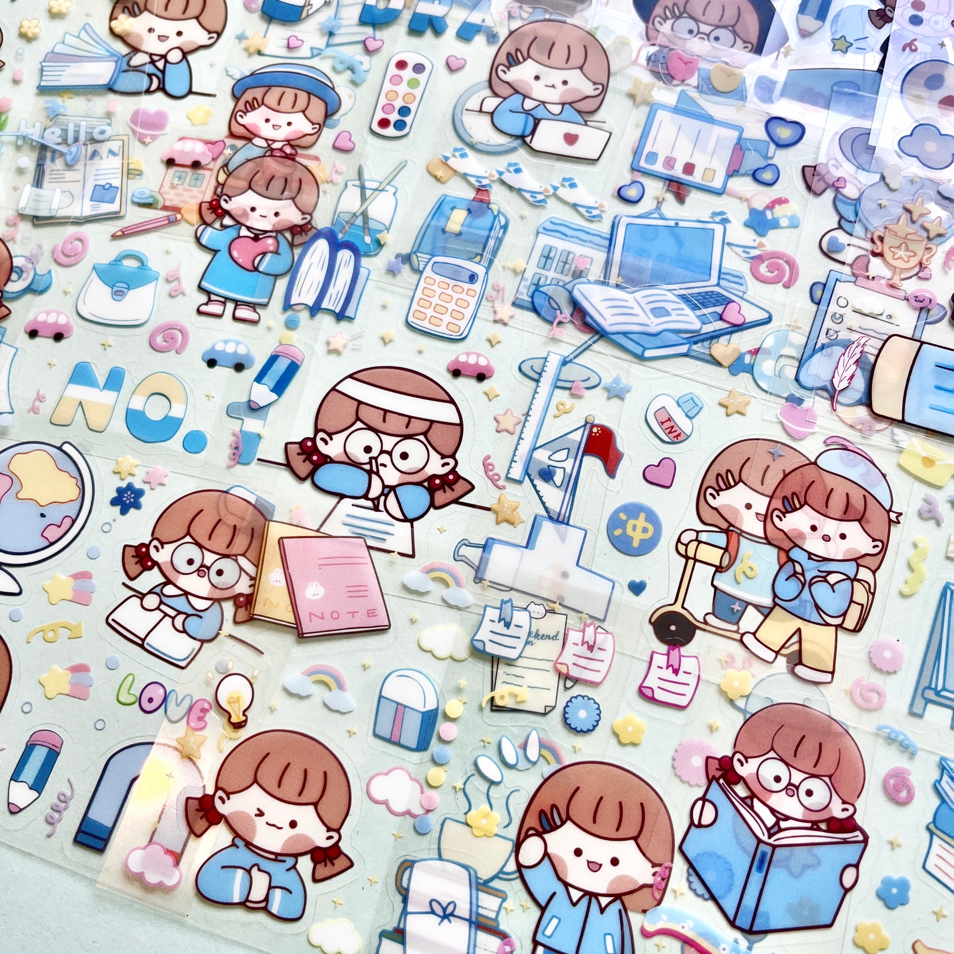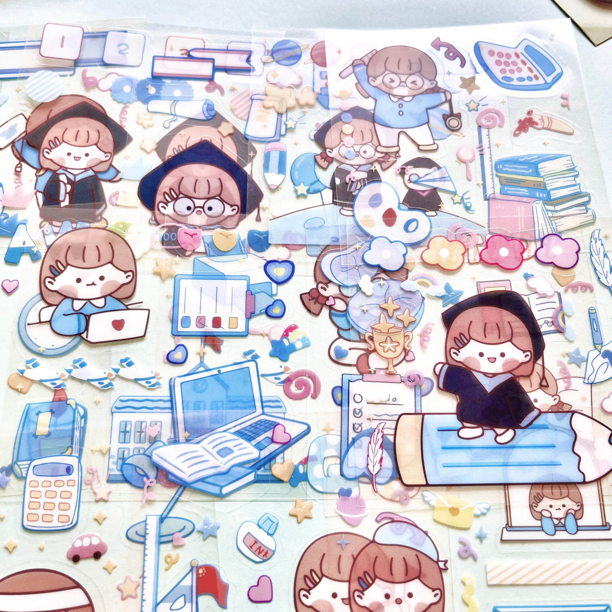 Lleva ternura y recuerdos escolares a tus creaciones con este set de 25 planchitas de stickers troquelados, con ilustraciones en tonos celestes y azules. 💙🖊️ Inspirado en la vida estudiantil, los diseños muestran a una niña kawaii en diferentes momentos escolares: yendo al colegio, con útiles, mochilas y hasta celebrando su graduación. 🎓🎀