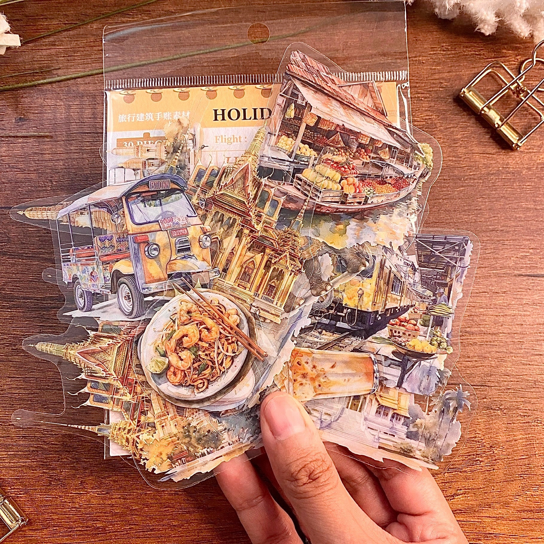 Descubre la esencia de Tailandia con este set de stickers en material PET, inspirados en un viaje a Bangkok. 🛕🌿 Con ilustraciones detalladas de elementos icónicos de la ciudad, estos stickers transparentes son perfectos para decorar journals, planners y scrapbooks con un toque exótico y aventurero.