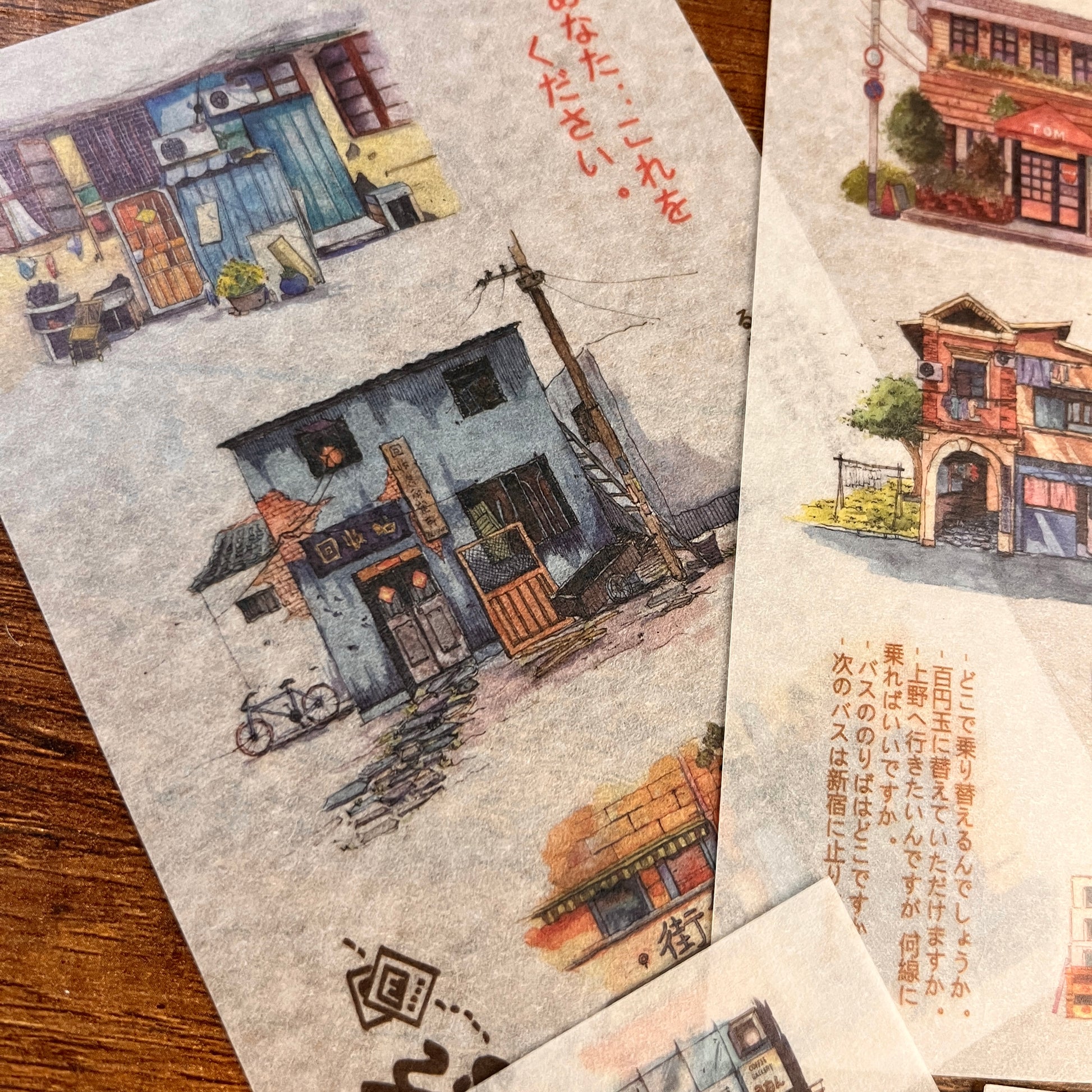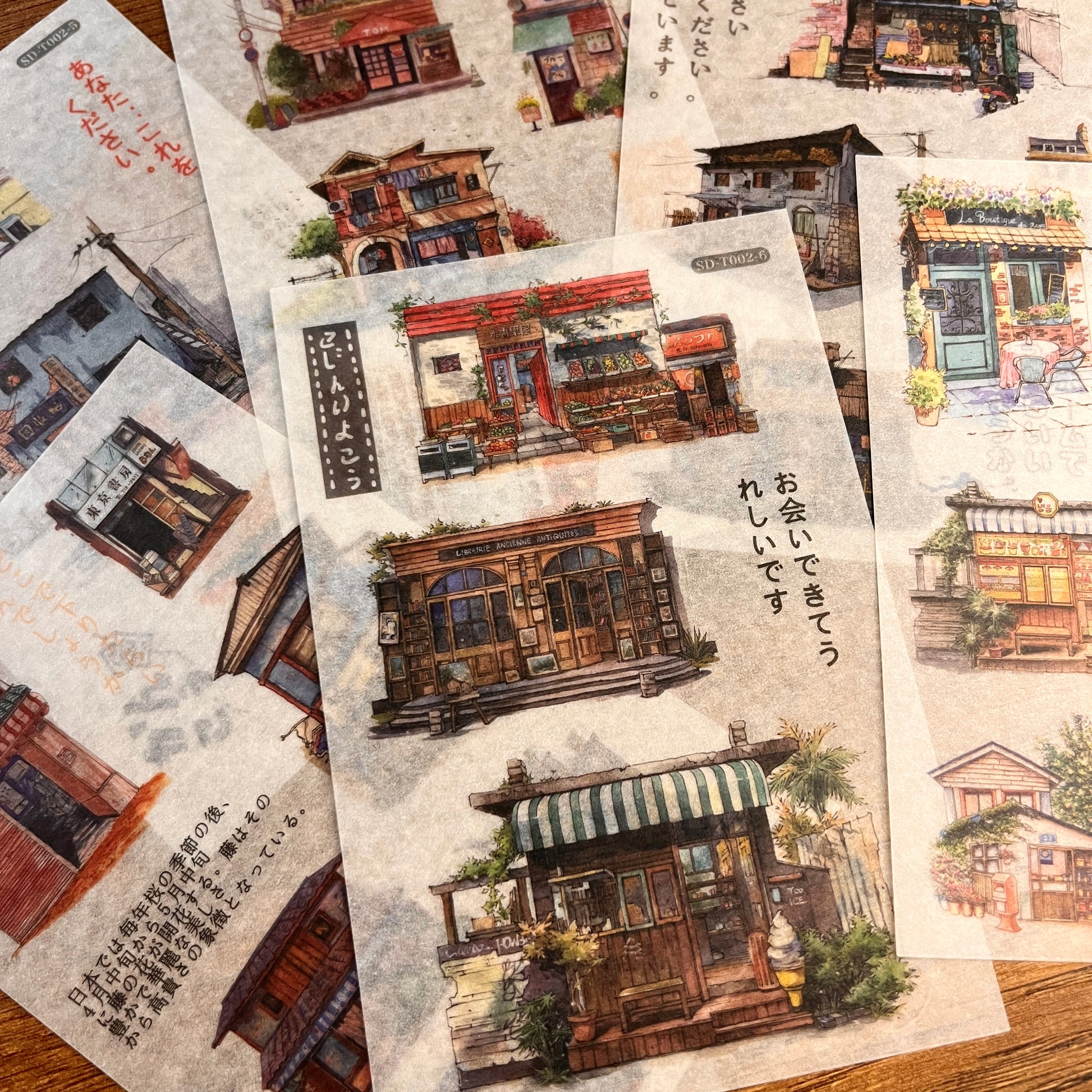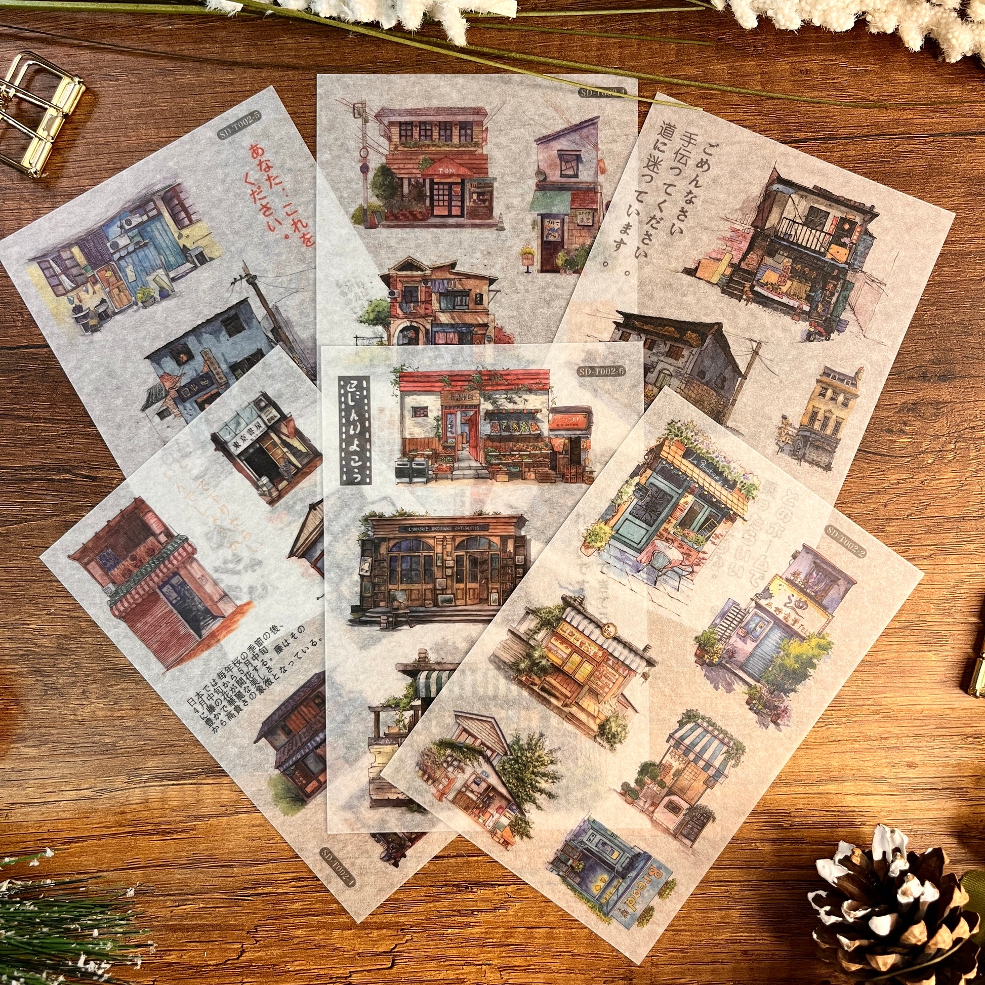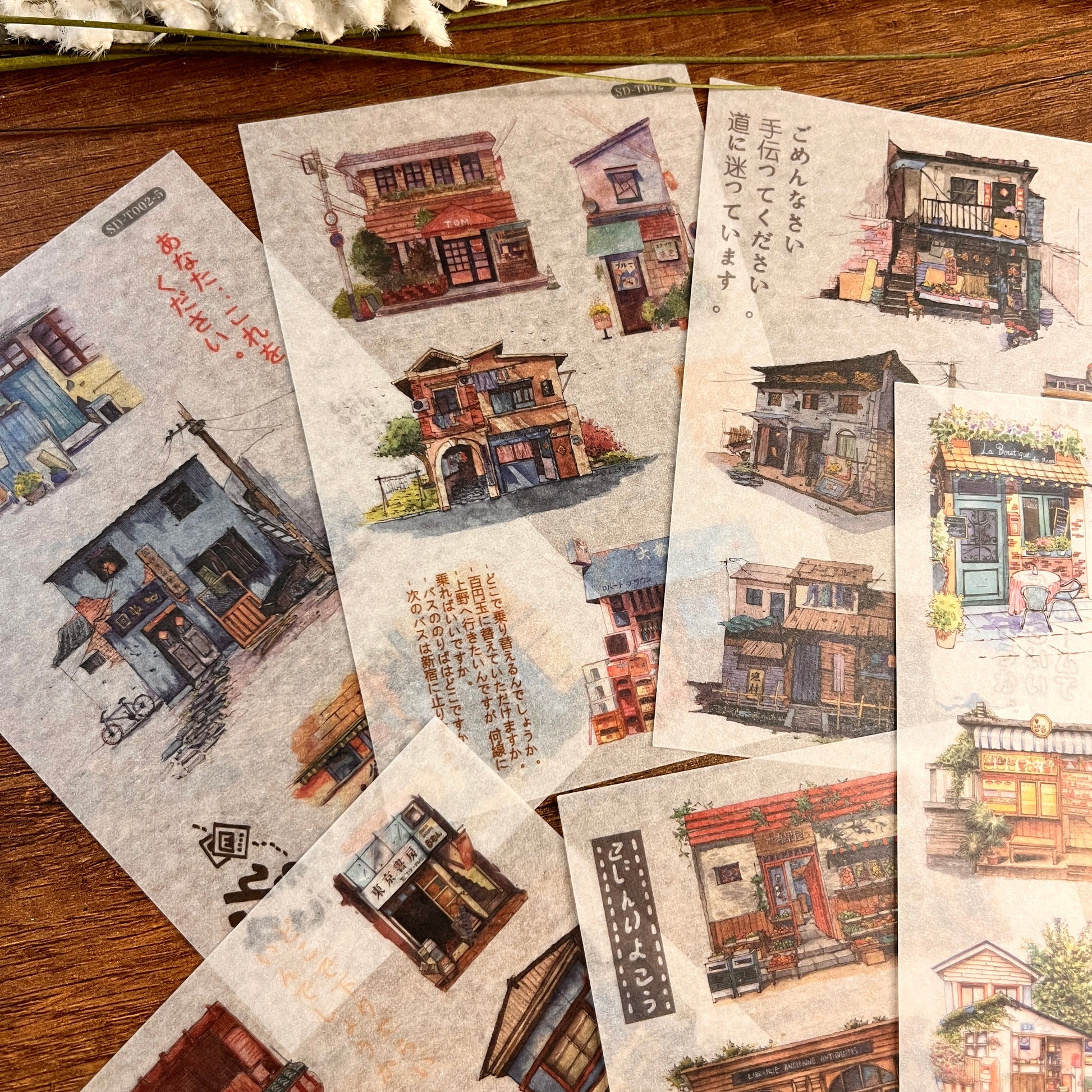Explora la esencia de los paisajes urbanos asiáticos con este set de 6 planchitas de stickers troquelados, inspirados en fachadas de tiendas, casas y pequeños rincones con un estilo vintage. 🏡🏯✨ Cada ilustración captura la atmósfera nostálgica y auténtica de calles llenas de historia, perfectas para darle un toque especial a tus journals, planners y scrapbooks.
