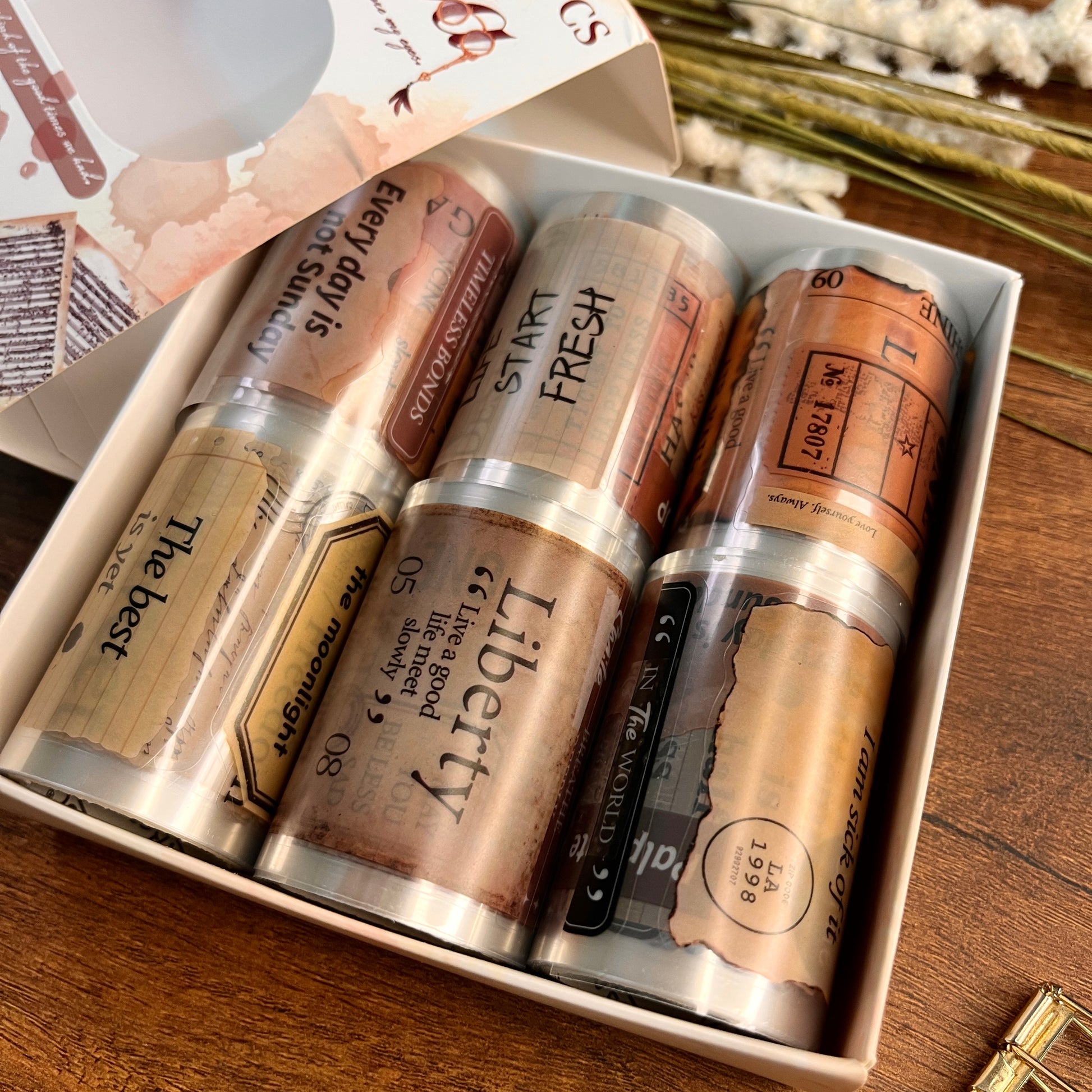 Dale un toque antiguo y nostálgico a tus creaciones con este set de 6 cintas troqueladas en rollo, inspiradas en papeles envejecidos, bordes quemados y fragmentos de texto en tonos marrones. 🕰️📖✨ Cada cinta contiene stickers troquelados en rollo, perfectos para decorar journals, scrapbooks y proyectos creativos con un aire vintage y literario.