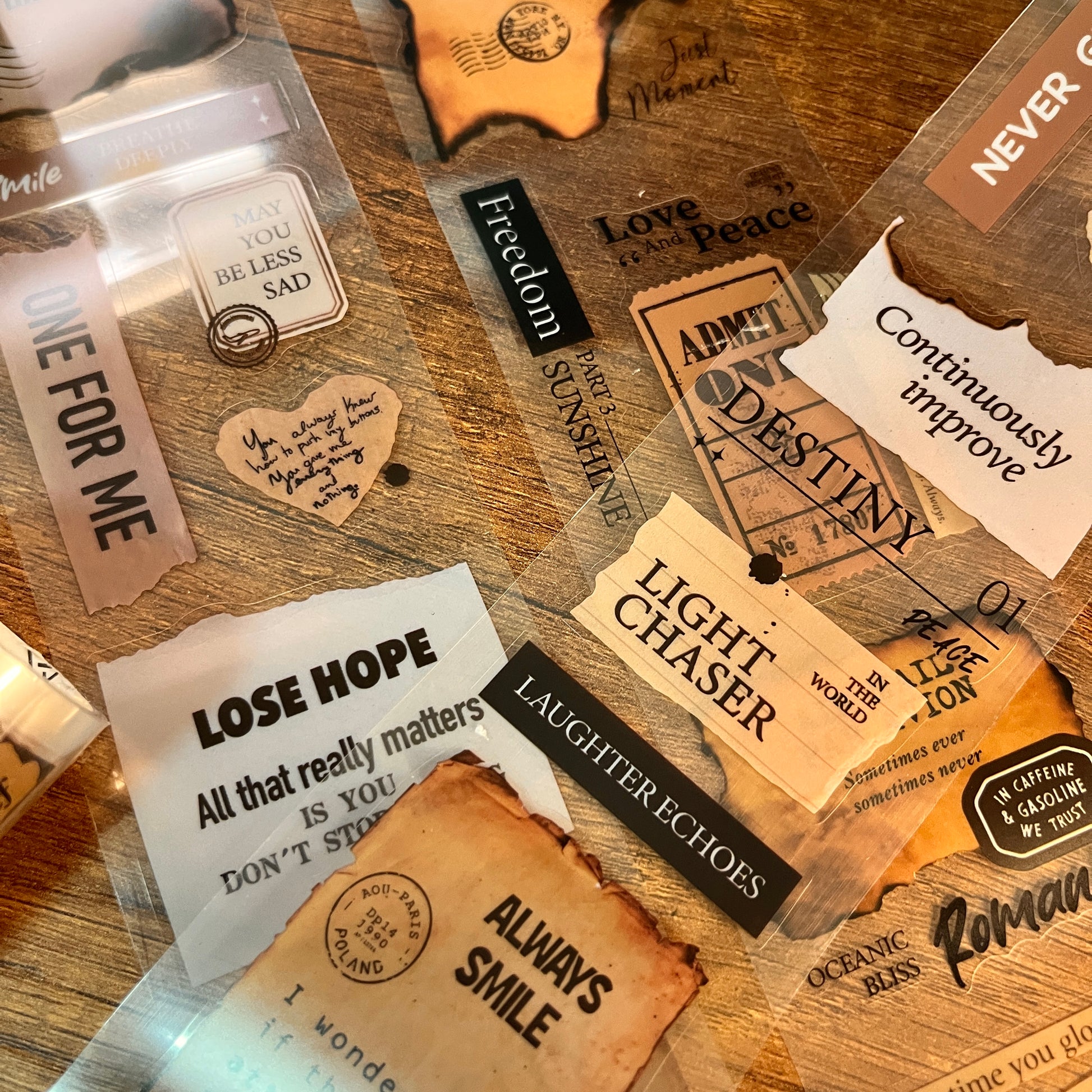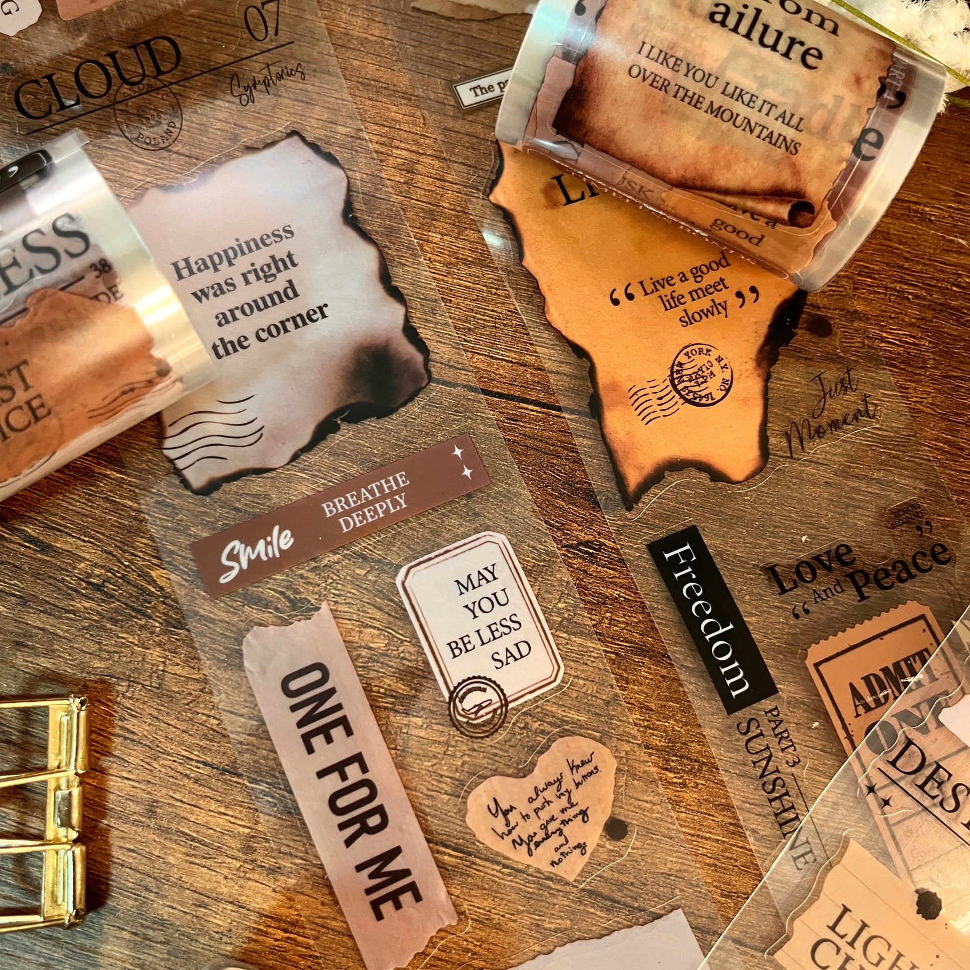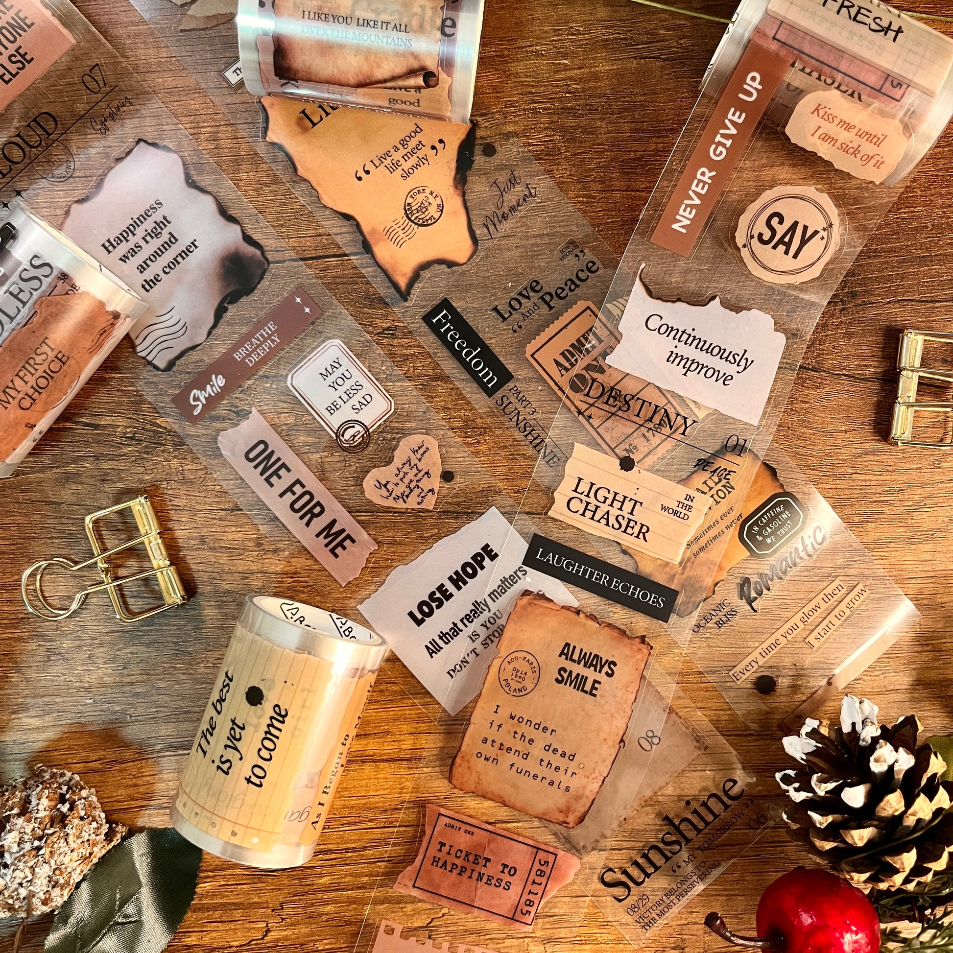 ✔ 6 rollos de stickers troquelados, con efecto de papel viejo y frases misteriosas ✂️